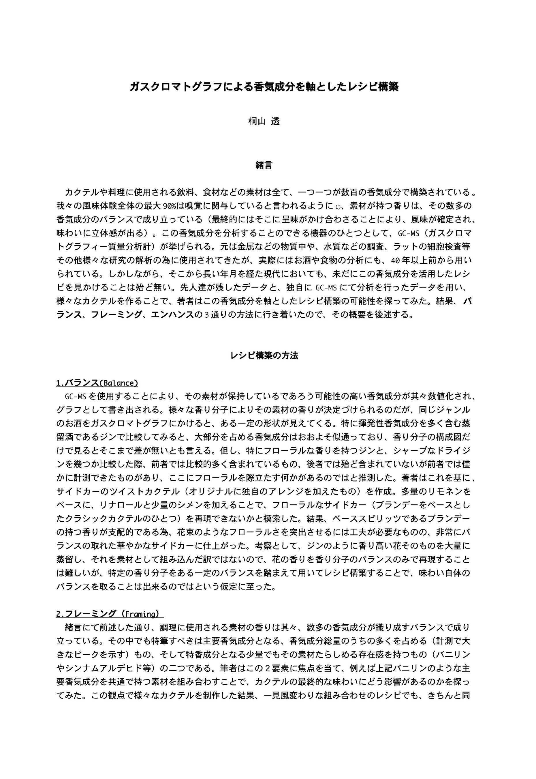 GC-MSによる香気成分の分析は数十年前から行われてきたものの、実際にそれを応用してレシピを作られるには至っていなかった。ネットや文献に挙げられている過去の分析結果と、自身でGC-MSを使用し解析した不足分のデータを用いることで、桐山氏はそれを実践。そこから得た結果で、『バランス』『フレーミング』『エンハンス』という3タイプの独自の考察を挙げた。