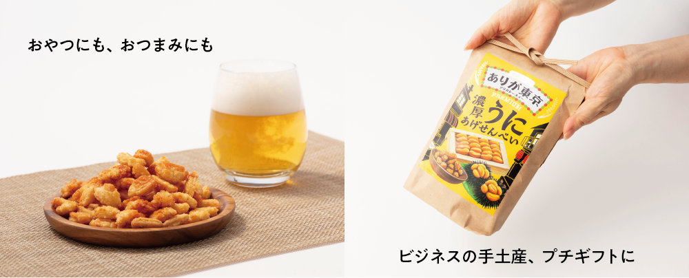 ありが東京は、国内産うるち米の生地を100%こめ油でカラッと揚げた小粒の揚げせんべいを、特製の味付けで仕上げました。お米の選別から味の決め手になる調味料、こだわりの揚げ油など、どれも生産者の顔が見える厳選の素材を使用しています。また、パッケージに「米袋」を採用するなど、とことんお米にこだわりました。