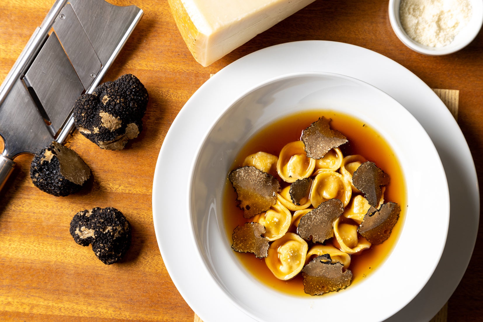 チキンラグー、マスカルポーネ、パルメザンチーズ、レモンゼスト、ナツメグ、タイムなどを生パスタに詰めて風味豊かに仕上げました。ヨーロッパ産の黒トリュフがアクセントとなった琥珀色のチキンコンソメと一緒に食べると口の中にトリュフの香りが広がります。