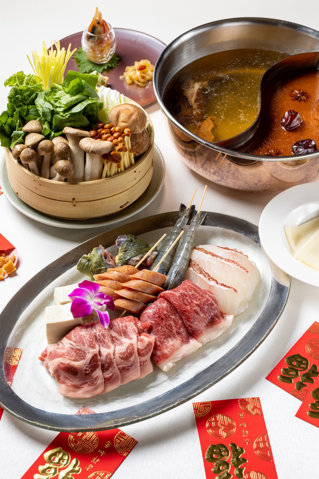 スタイリッシュな空間で楽しむ創造性あふれた中国料理が人気の「チャイナルーム」では、“新たな一年が健康で幸せに満ちた年になりますように”との願いを込めて「開運コラーゲン火鍋」をご提供いたします。古来より滋養強壮・不老長寿に優れた食材として珍重されてきたすっぽんをはじめ、世界でも最高品質と称賛されるニューカレドニア産の「天使の海老」、沖縄三大高級魚の一種と言われ縁起のいい鮮やかな赤い身体をしたスジアラ(アカジンミーバイ)など、高級で希少な食材をふんだんにつかった火鍋です。そのほか、栄養価の高いキノコを4種類、国産のこだわりの野菜をと一緒に、濃厚なスープに絡めてお楽しみください。