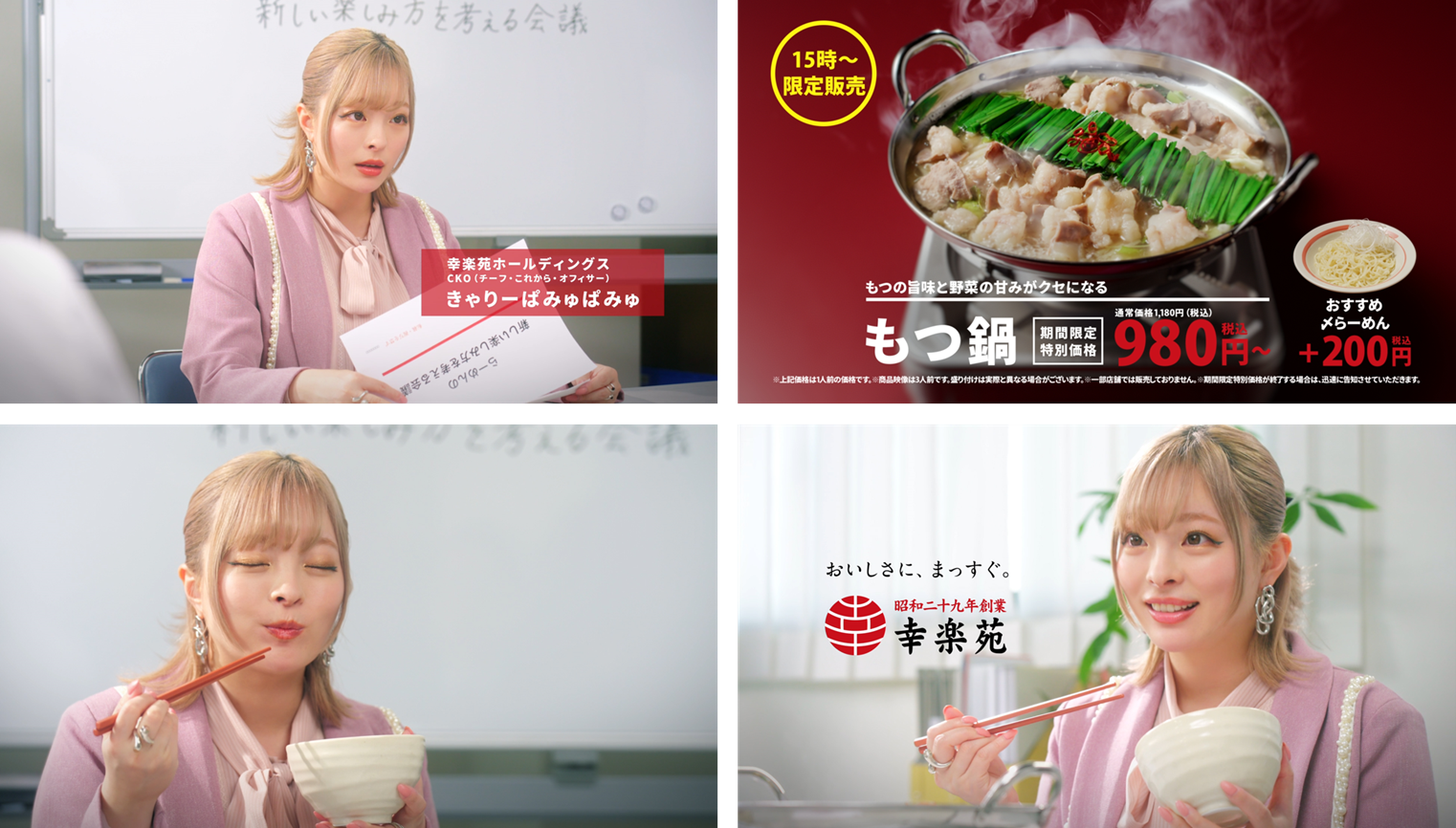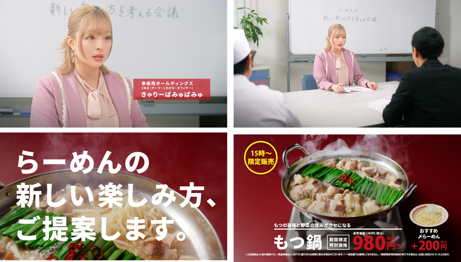 TVCMでは、幸楽苑の「チーフ・これから・オフィサー(CKO)」のきゃりーぱみゅぱみゅさんが、新メニュー会議で「もつ鍋」を味わいます。ぐつぐつと煮える、低カロリー、コラーゲンたっぷりの幸楽苑オリジナルもつ鍋とらーめんを美味しそうに頬張るきゃりーぱみゅぱみゅさんは必見です。ぜひ御覧ください。
