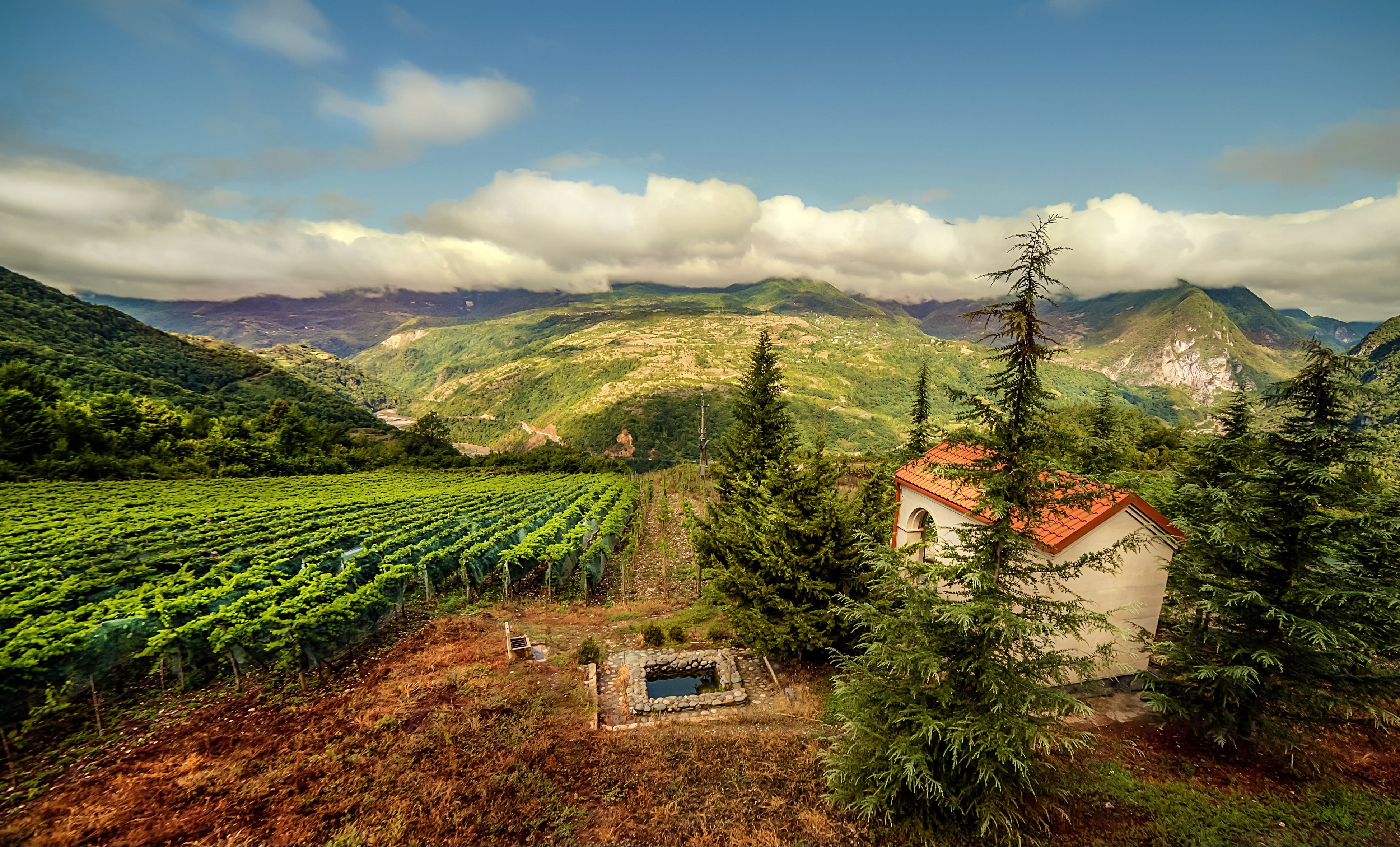 アジアとヨーロッパが出会うコーカサス地方にあるジョージアは古くから東西貿易の要として発展し、温暖な気候と豊穣な大地の恵みをもとに8000年に及ぶワイン作りの長い歴史や伝統を育んできました。ジョージア南東部の紀元前6000年頃の遺跡から発掘された土器からはワインを醸造した痕跡が残っているのが発見されています。今日に至るまで粘土製の素焼きの容器(クヴェヴリ)を用いたワインの醸造法は受け継がれていて、2013年にはユネスコの無形文化遺産に登録されています。ジョージアには1000を超えるワイナリーがあり、一般家庭でもホームメイドワインを作り楽しんでいます。