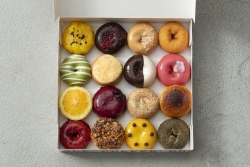 ROOTH ドーナツはニューヨークで着想を得て開発した直径 5 cmのドーナツ。生地にヨーグルトを入れ、甘さひかえめ。カラフルなソースコーティングは手作りでひとつひとつ仕上げています。