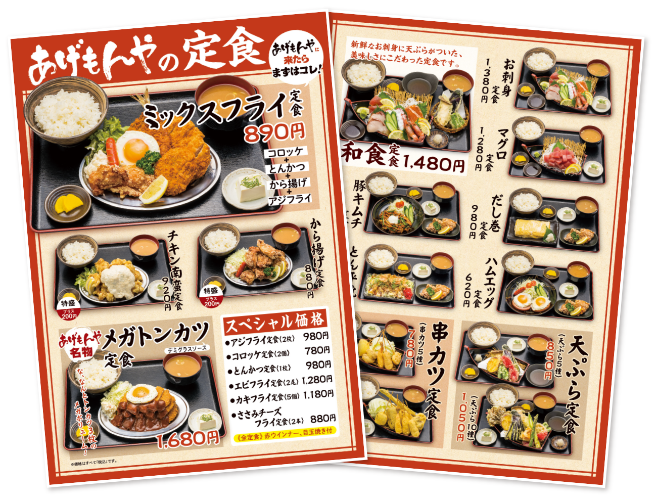 「あげもんや」ならではのボリュームやコスパで、毎日通える豊富なメニューがずらり!“飲み”以外でもご利用いただけます。