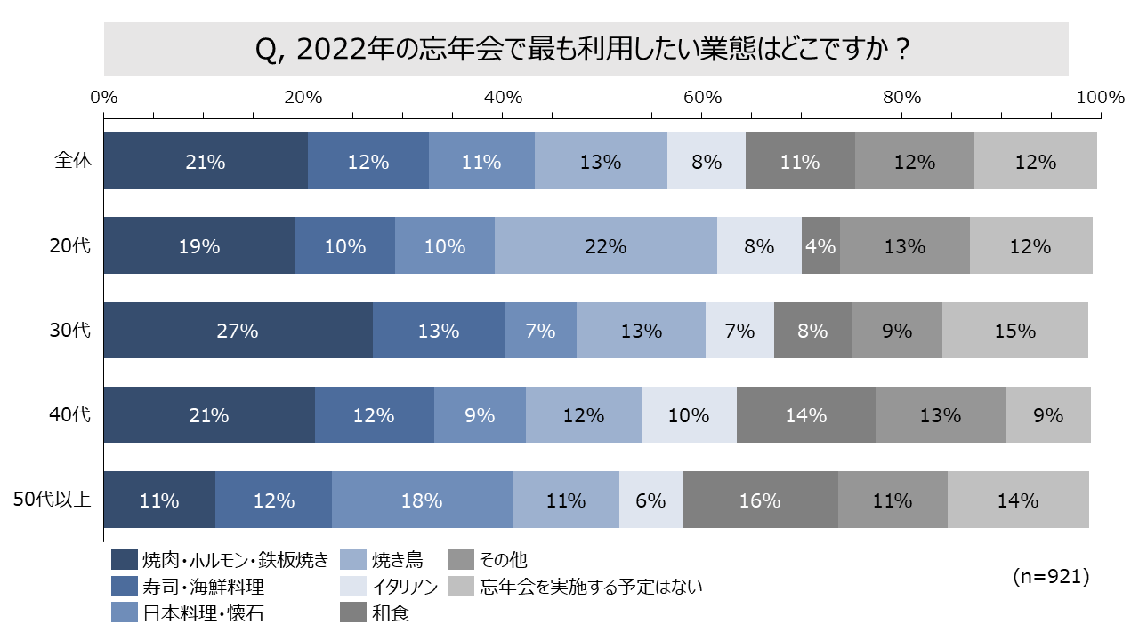 今年の忘年会は昨年(2021)年と同回数以上実施しそうな方81%、減りそうと答えた方は19%でした。今年の忘年会の実施は12月初旬に決める方が67%、11月下旬に決める方は13%でした。「焼肉・ホルモン・鉄板焼き」のあるお店で忘年会をしたいという方21%、2020年の忘年会でも同様に人気の業態となっていました。今年、忘年会を行うお店において重視する点は「コロナ対策をしている」43%、「ゆっくり会話できる雰囲気」39%、「料理がおいしそう」39%が上位にきています。