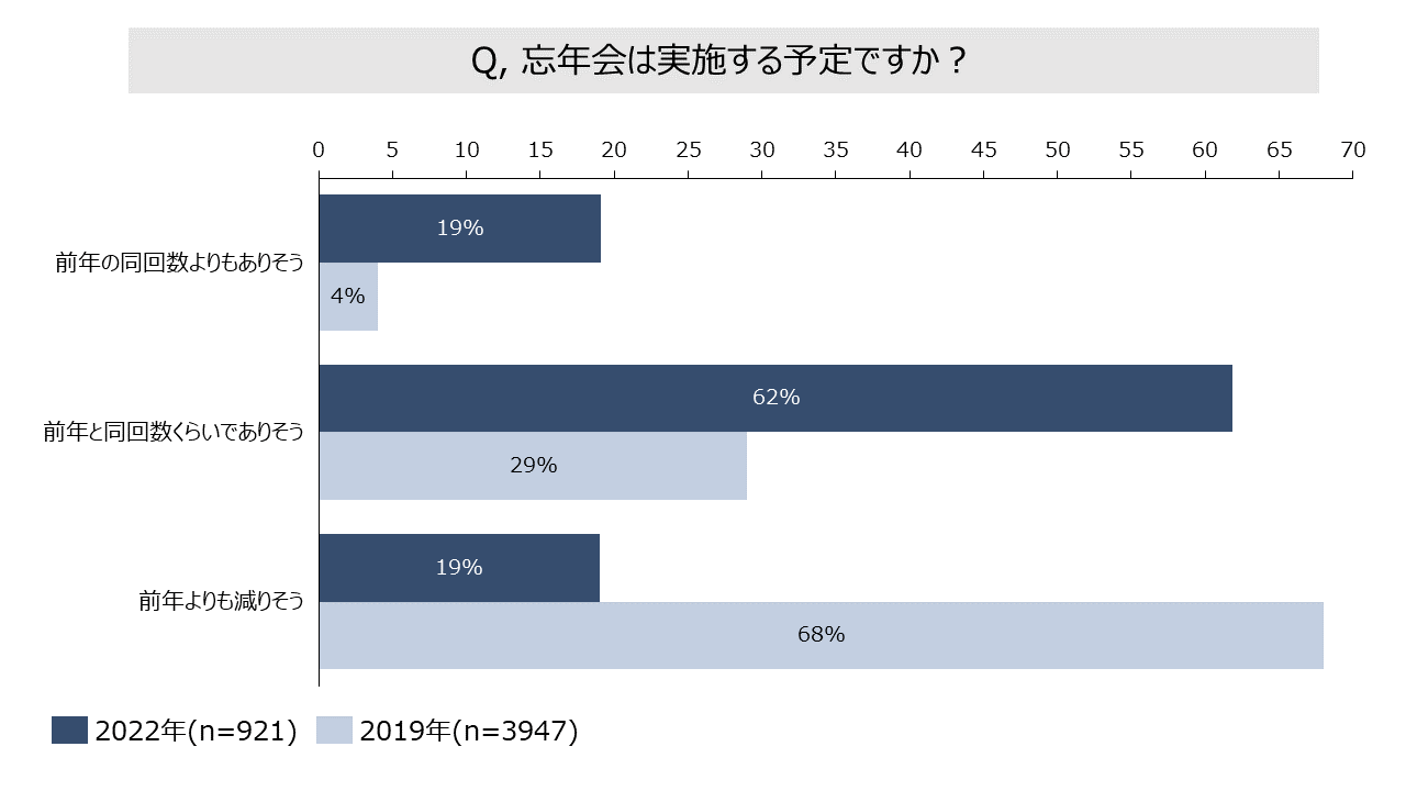 1. 2022年の忘年会は「昨年以上にありそう」が81%、2020年の忘年会は「昨年よりも減りそう」が68%