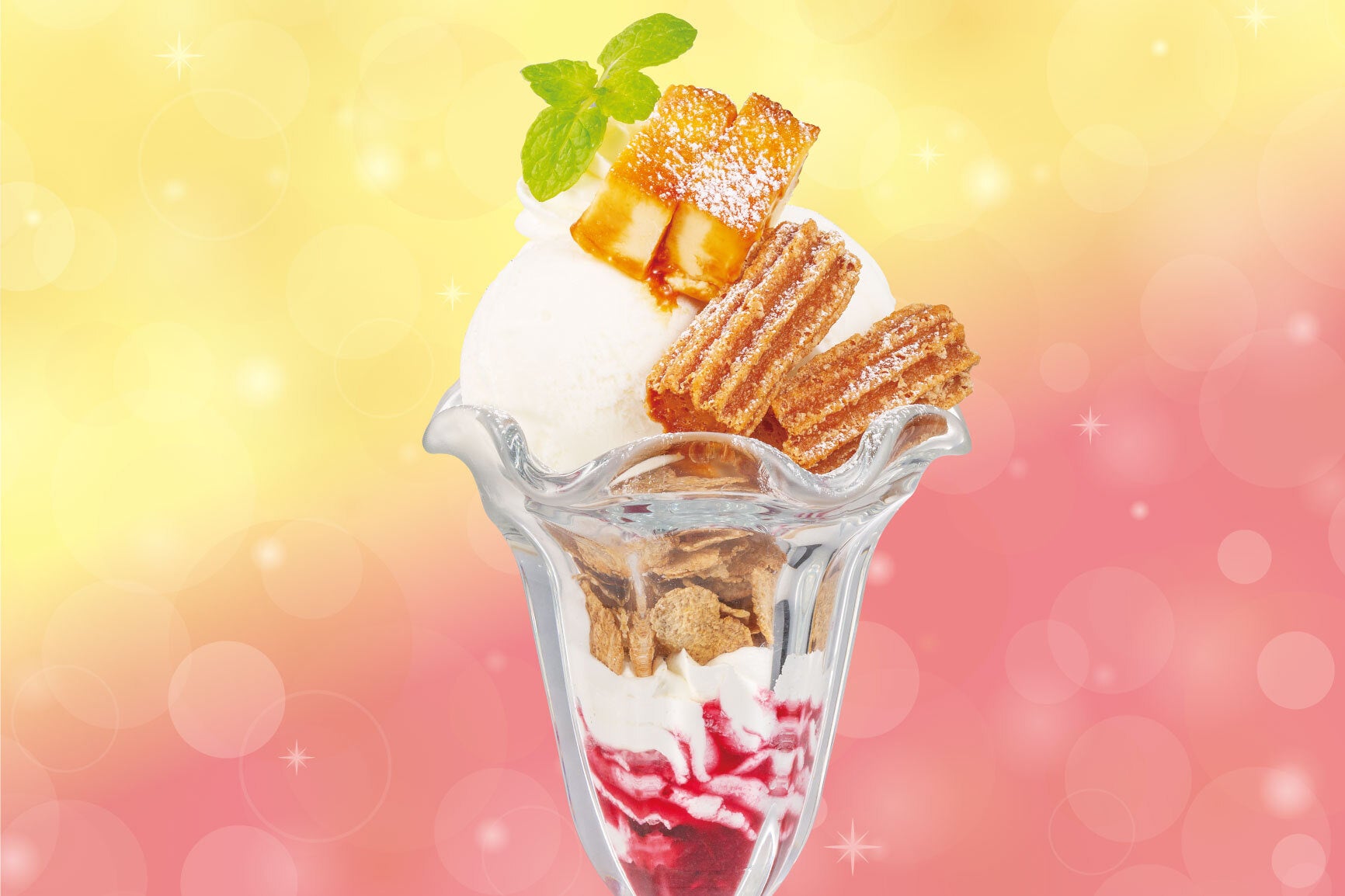 濃厚なカタラーナ、ミルキーな北海道クリームチーズジェラート、サクサク食感のチュロスがトップ部分に飾られた冬らしい色あいのパフェです。縦長のグラスの中には、玄米フレークやホイップ、ベリーソースの層が重なって、食べ進めるごとに様々な食感と味わいが楽しめます。価格は790円(税込869円)