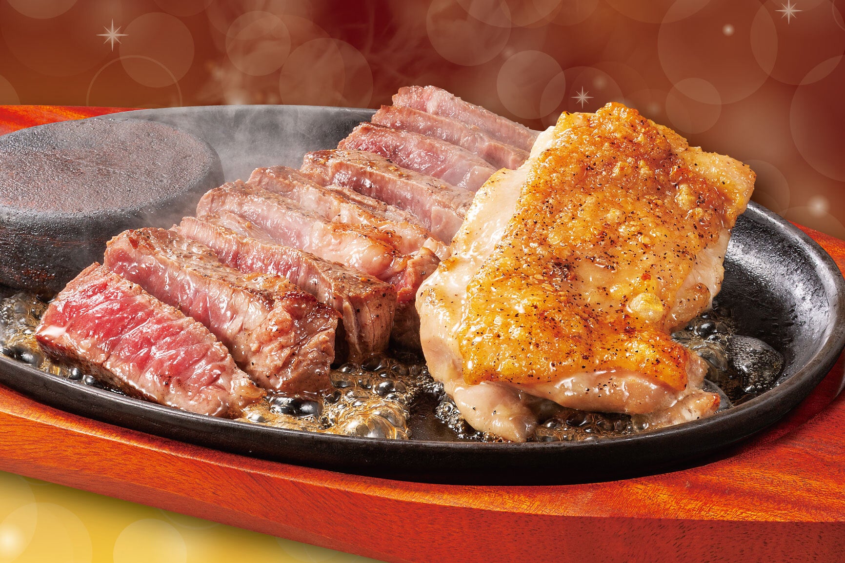 “激アツステーキ”は“リブロインステーキ”と並ぶ「ステーキのどん」の看板メニューです。レアで焼き上げた肩ロースステーキをアツアツの鉄板でご提供いたします。鉄板に載っているペレットで、ステーキをお好みの焼き加減にしてお召し上がりください。今回のフェアは人気の“激アツステーキ”とチキングリルをコンビにしてリーズナブルなボリュームメニューにいたしました。おかわり自由のライス・パン・スープバー付。