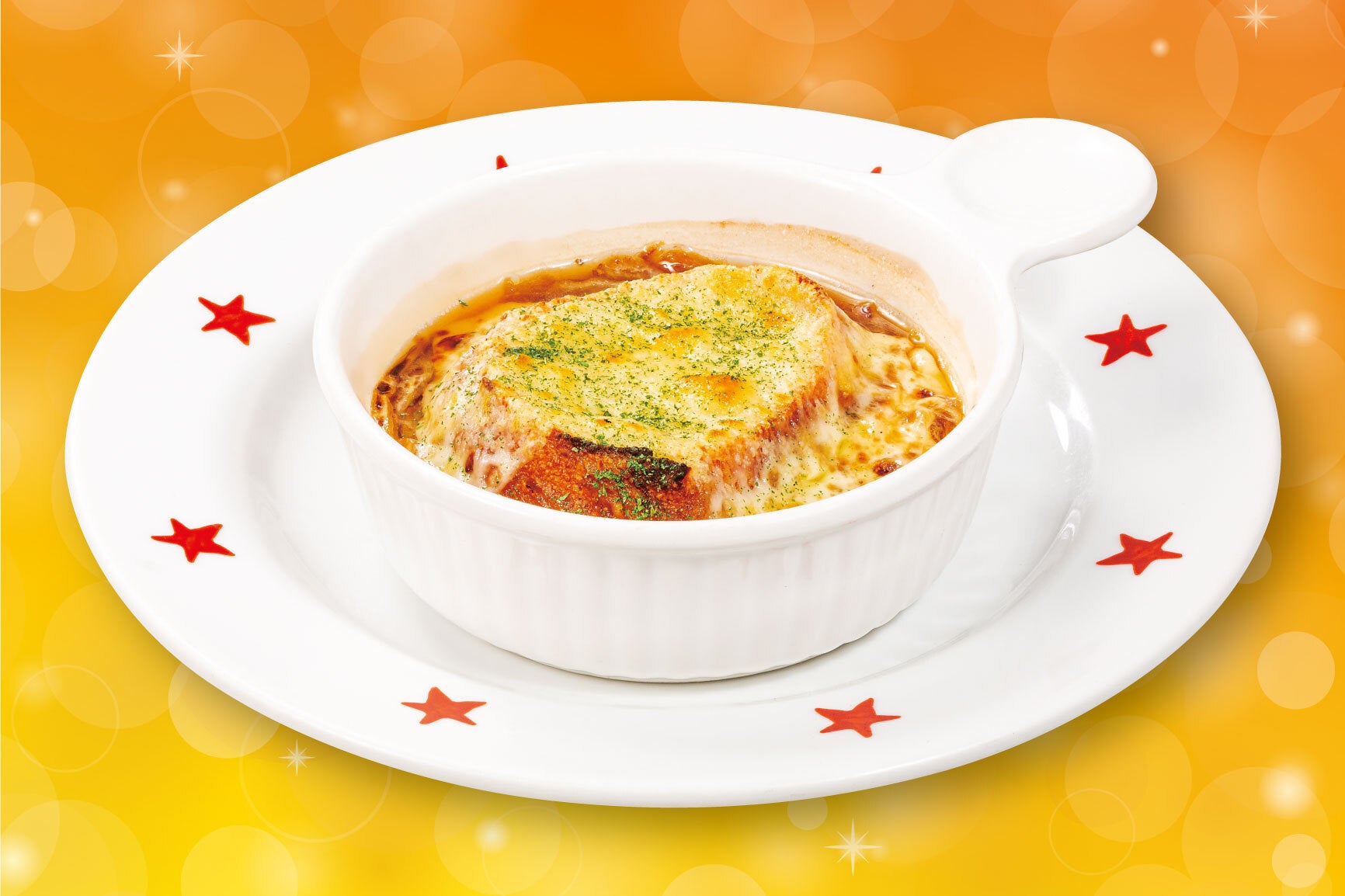 牛肉の旨みが染み出たオニオンスープに、バゲットとチーズをのせてオーブンで焼き上げました。焼けたチーズとスープのしみ込んだバゲットのとろりとした食感をお楽しみください。
