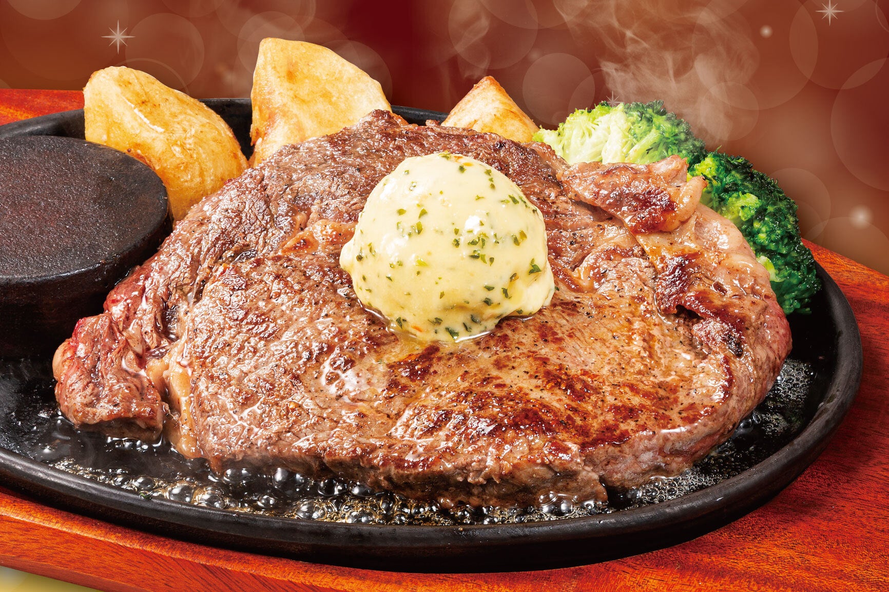 “リブロインステーキ”は、一般的には“リブロース”と呼ばれる部位を厳選し、熟成させたお肉をグリルした「ステーキのどん」のオリジナルメニュー。ガーリックとアンチョビが効いた濃厚バターは、適度な塩味と深いコクでライスにもパンにもよく合います。おかわり自由のライス・パン・スープバー付。価格はステーキの重量により異なります。