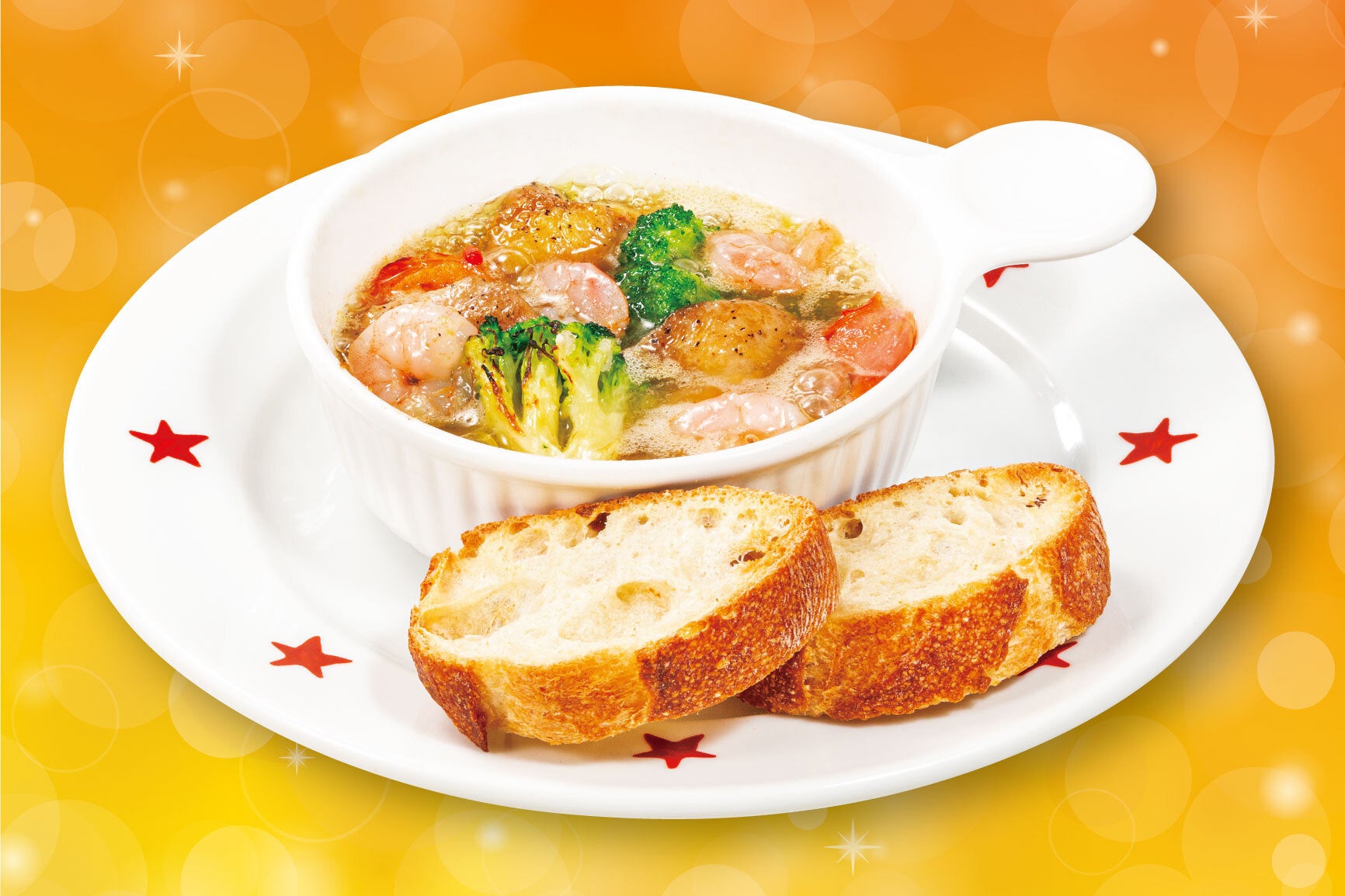 チキン・エビ・ブロッコリー・ミニトマトをにんにくとオイルで煮込んだ、彩りのあるサイドメニューです。旨みの染み出たガーリックオリーブオイルも、ぜひサクサクのバゲットにつけてお楽しみください。