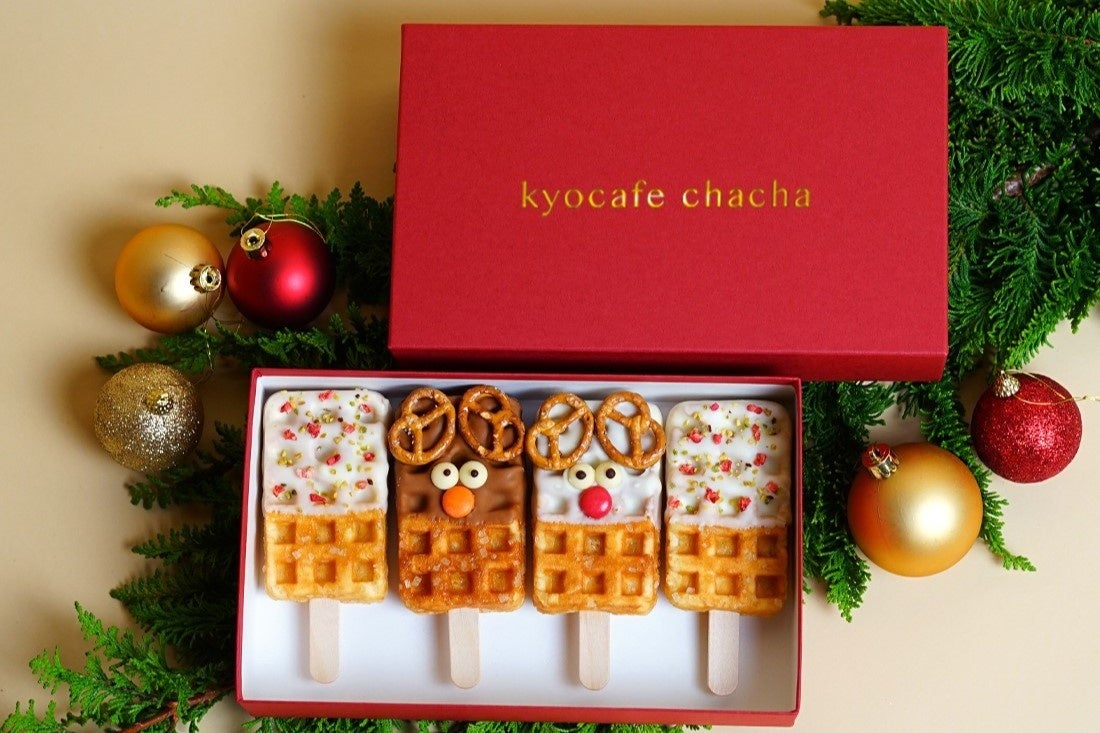 ポップアップストアでは、キュートな姿をしたトナカイワッフルは入ったクリスマス期間限定ホリデーBOXや、京都の実店舗やWEBショップでも大好評中の定番商品「いろどり京ワッフルボックス(4本セット)」も提供いたします。