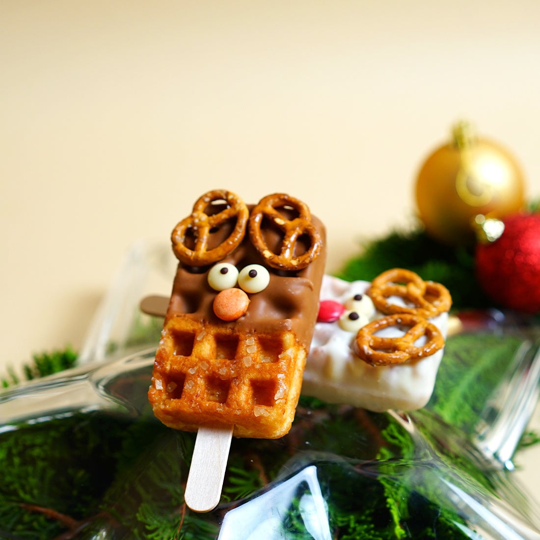 焼き上がった生地には、キャラメルチョコやホワイトチョコをたっぷりとディップ。トナカイの角に見立てたプレッツェル・鼻は赤やオレンジのチョコ、キョロっとした目をトッピング。