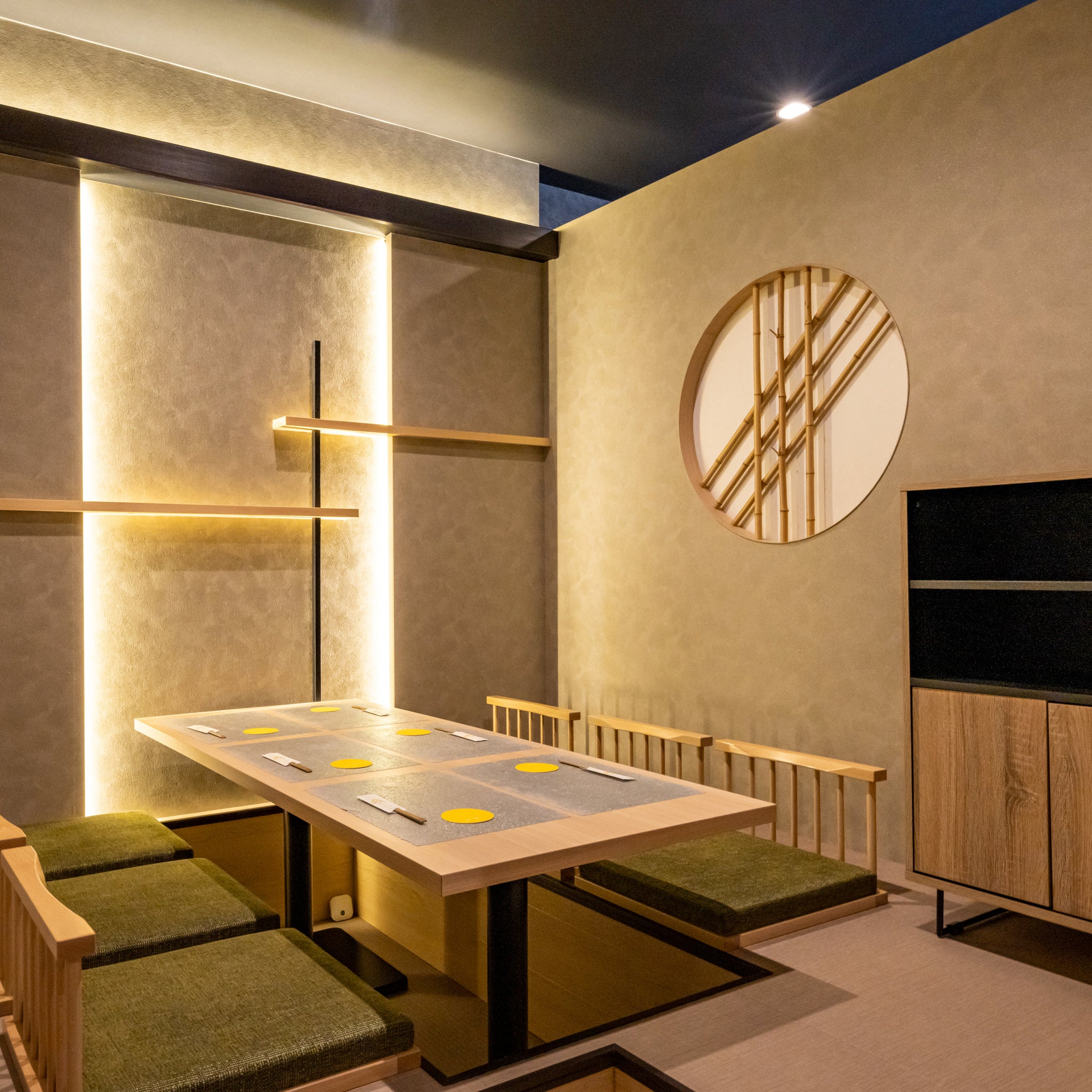 お客様がリラックスし居心地が良いと思われる、暖かみのある和モダンな空間を演出いたしました。テーブル席、カウンター、洋室・和室の個室をご用意しております。あまり重視されないトイレだからこそ、ゆっくりしていただけるよう地域最大級の広さを確保いたしました。