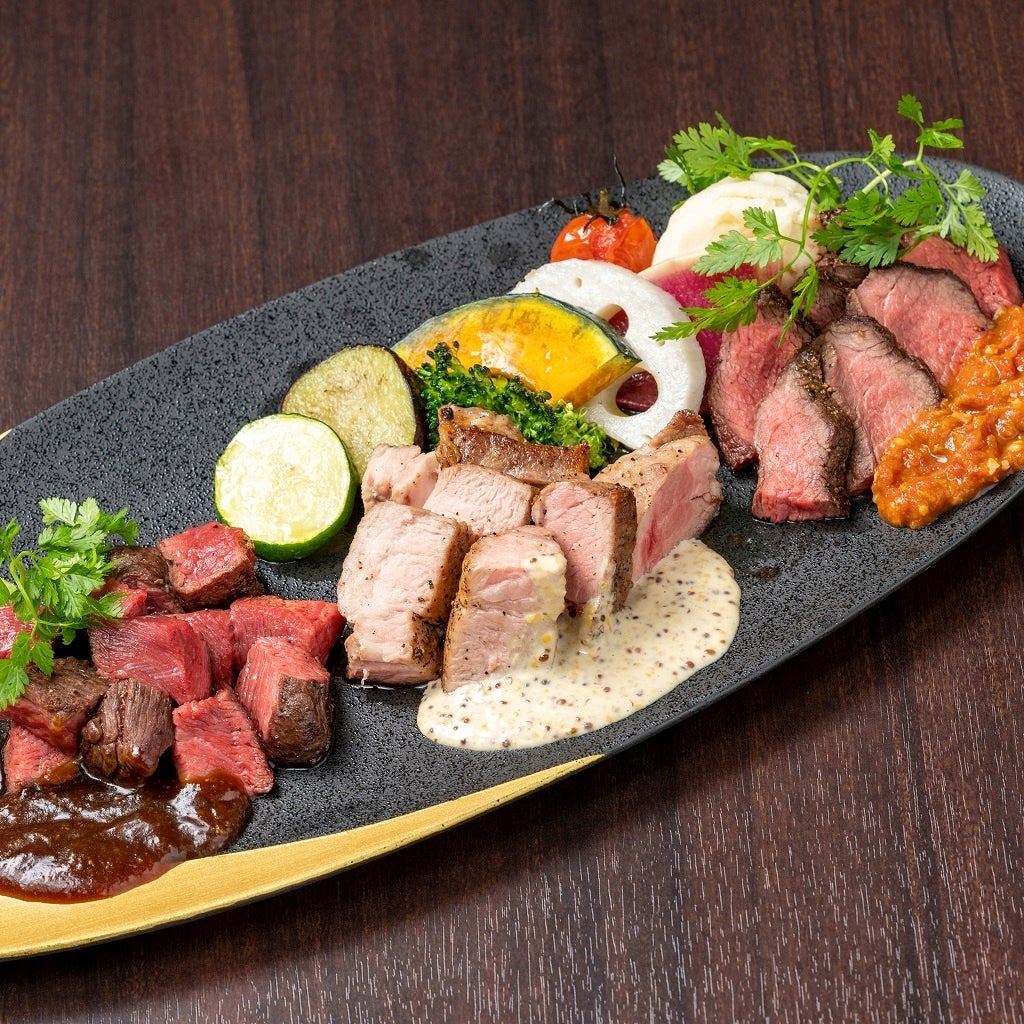 和牛イチボ、和牛芯玉カブリ、国産豚肩ロースの3種を盛り合わせた当店一番人気メニュー。