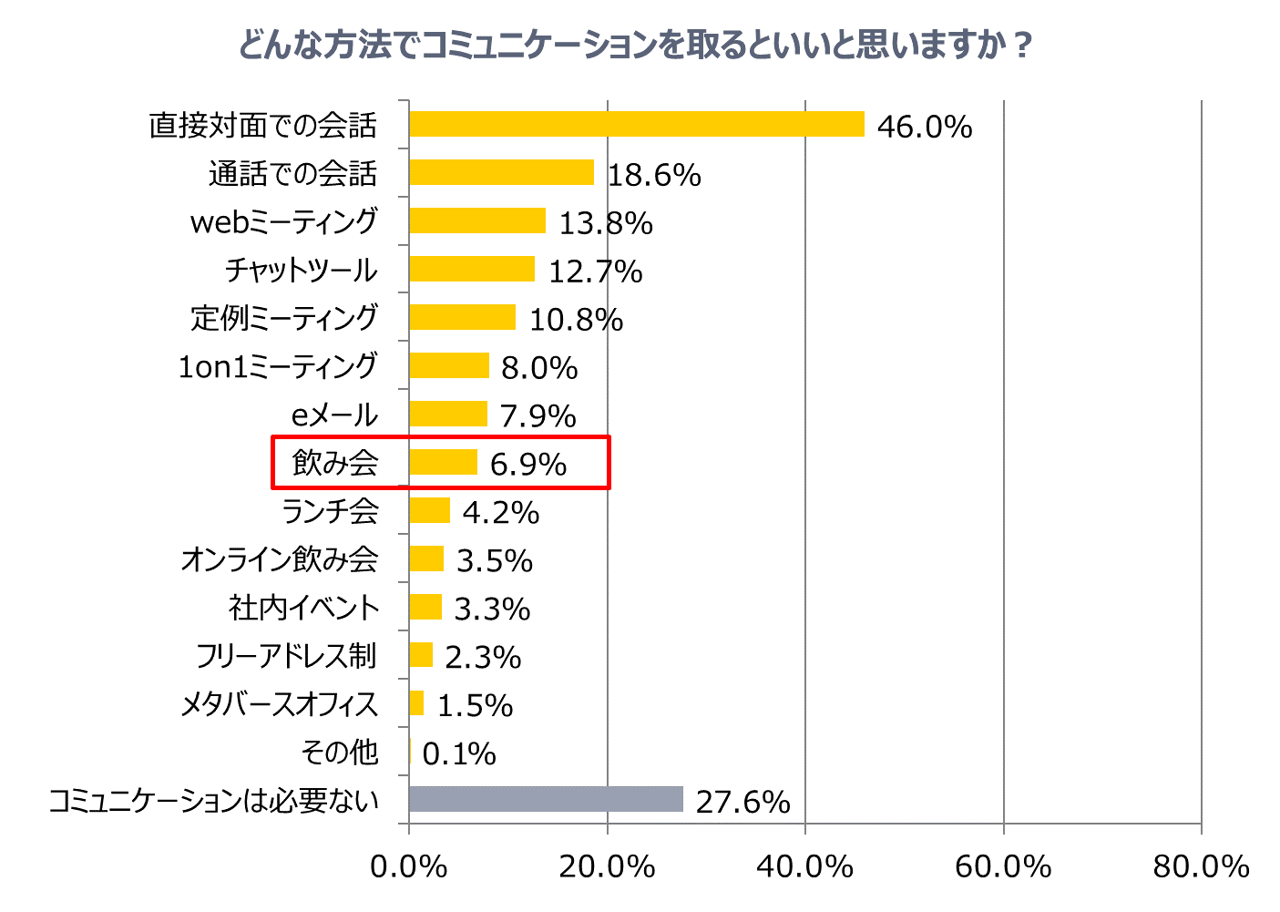 「直接対面での会話」が46.0%、「通話での会話」が18.6%、「webミーティング」が13.8%と、やはり口頭でのコミュニケーションが上位になりました。