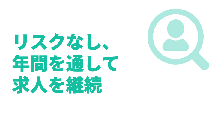 アルバイト1応募あたり4000円(税別)〜と、リーズナブルな料金で、サポートは無期限で継続されます。手間やリスクなしで一年を通した求人活動が可能になり、余裕を持って応募を獲得し、そのなかから良い人材を選んで採用できます。なお、サービスの利用停止と再開は自由です。