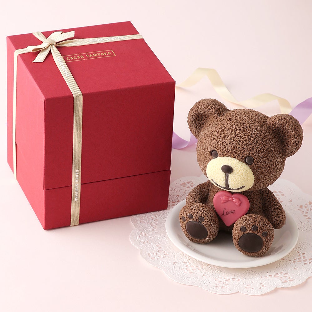 バルセロナのショコラティエが1点1点手作りでご用意するベア型のチョコレートは、ふわふわの毛並みまで精巧に表現しており、まるでぬいぐるみのテディベアのよう。まろやかで優しい甘みのミルクチョコレートのベアに、Loveとかかれたロゼ(ピンク)色のハートを飾りつけました。