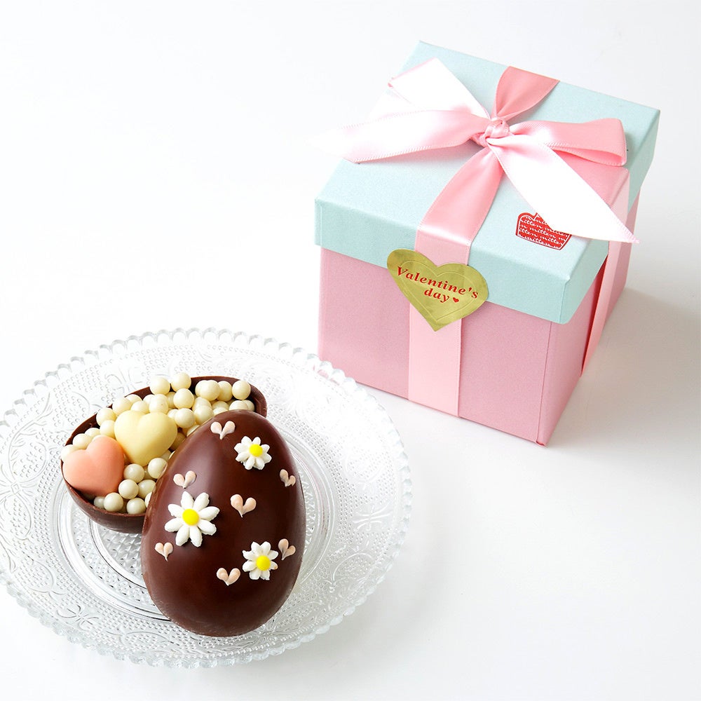チョコレートは香り高いベルギー産を使用。ミルクチョコレートのたまごの中から、小さなパールショコラと、ハート型チョコレート2粒が出現。思わず「キュン」としてしまう可愛い一品です。