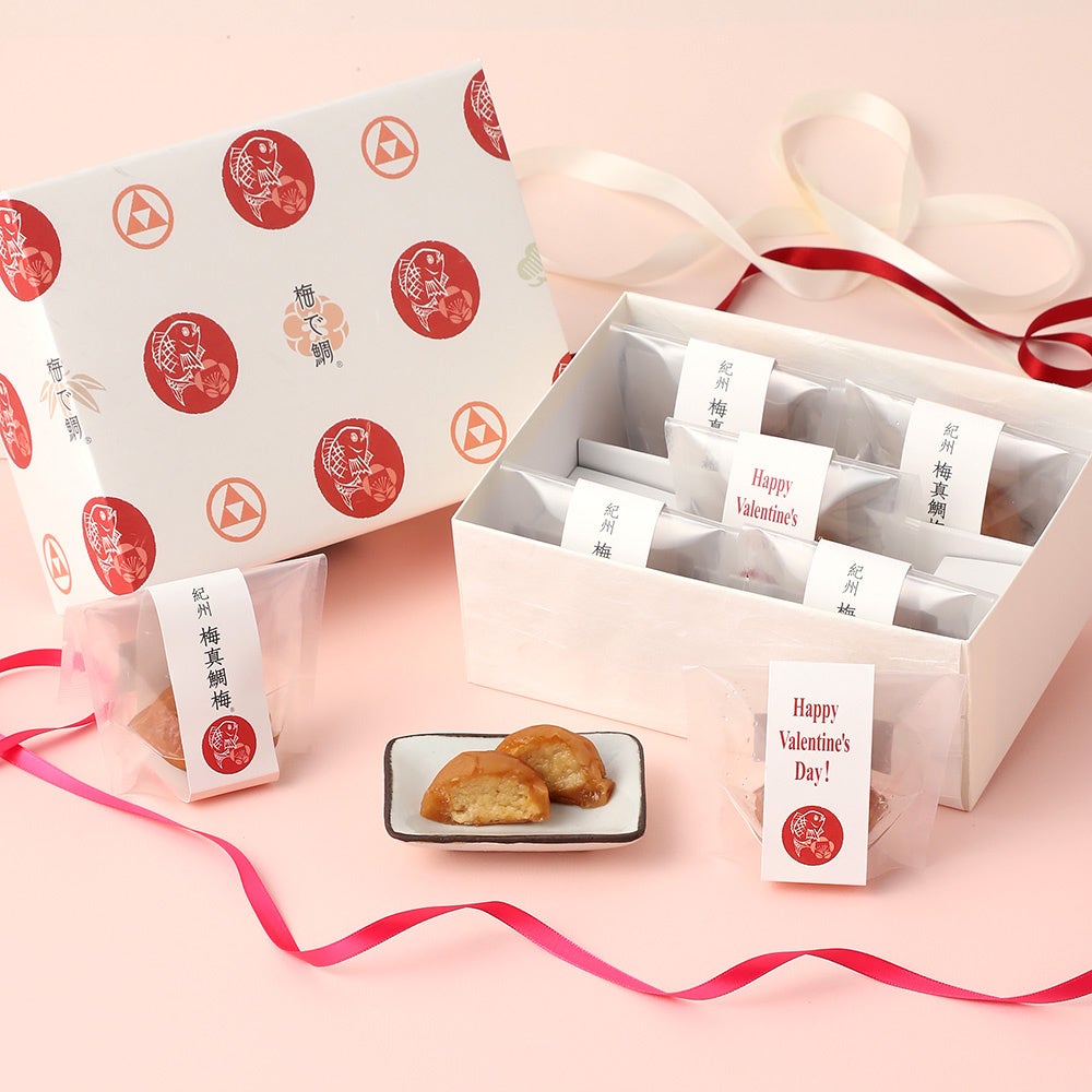紀州南高梅の種を取り、中に甘酢みそで味付けした紀州産真鯛のほぐし身を詰めています。そのままご飯に乗せても、お茶漬けやお酒の肴にしても、様々に楽しんでいただけます。「Happy Valentine’s Day!」のメッセージ帯を付けてお届け。