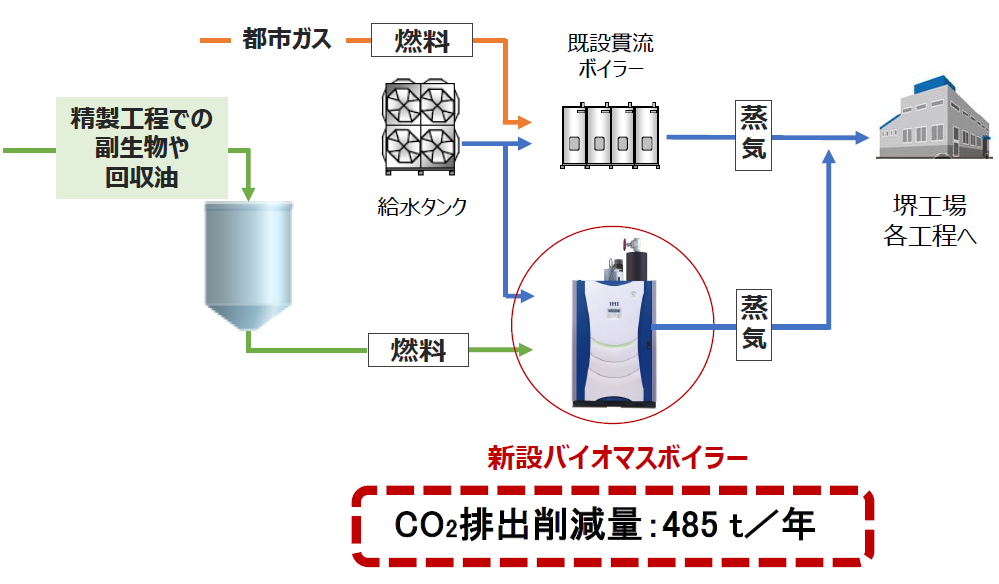このたび、その一環として、地球温暖化防止を目的に、堺工場にバイオマスボイラーを新設、2023年1月より