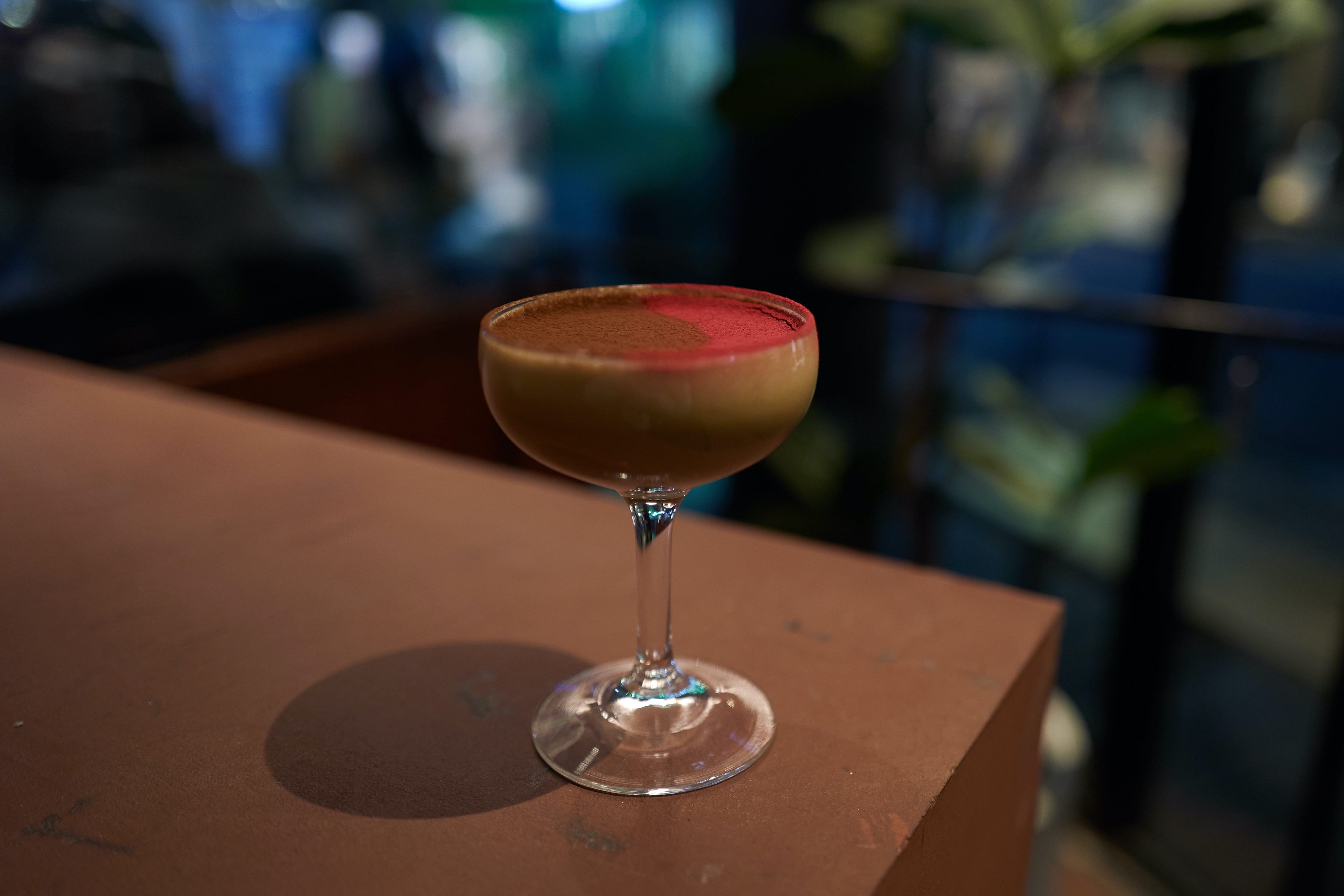 エスプレッソの風味に合うラムとクリームのベストマッチのカクテルを作りました。表面にはココアパウダーとラズベリーパウダーを振りかけ、大人のティラミスを表現。グラスに顔を近づけるとカカオの香り、一口含むとラズベリーやラムの香りとエスプレッソのフローラルな味わいがクリームと一体となります。