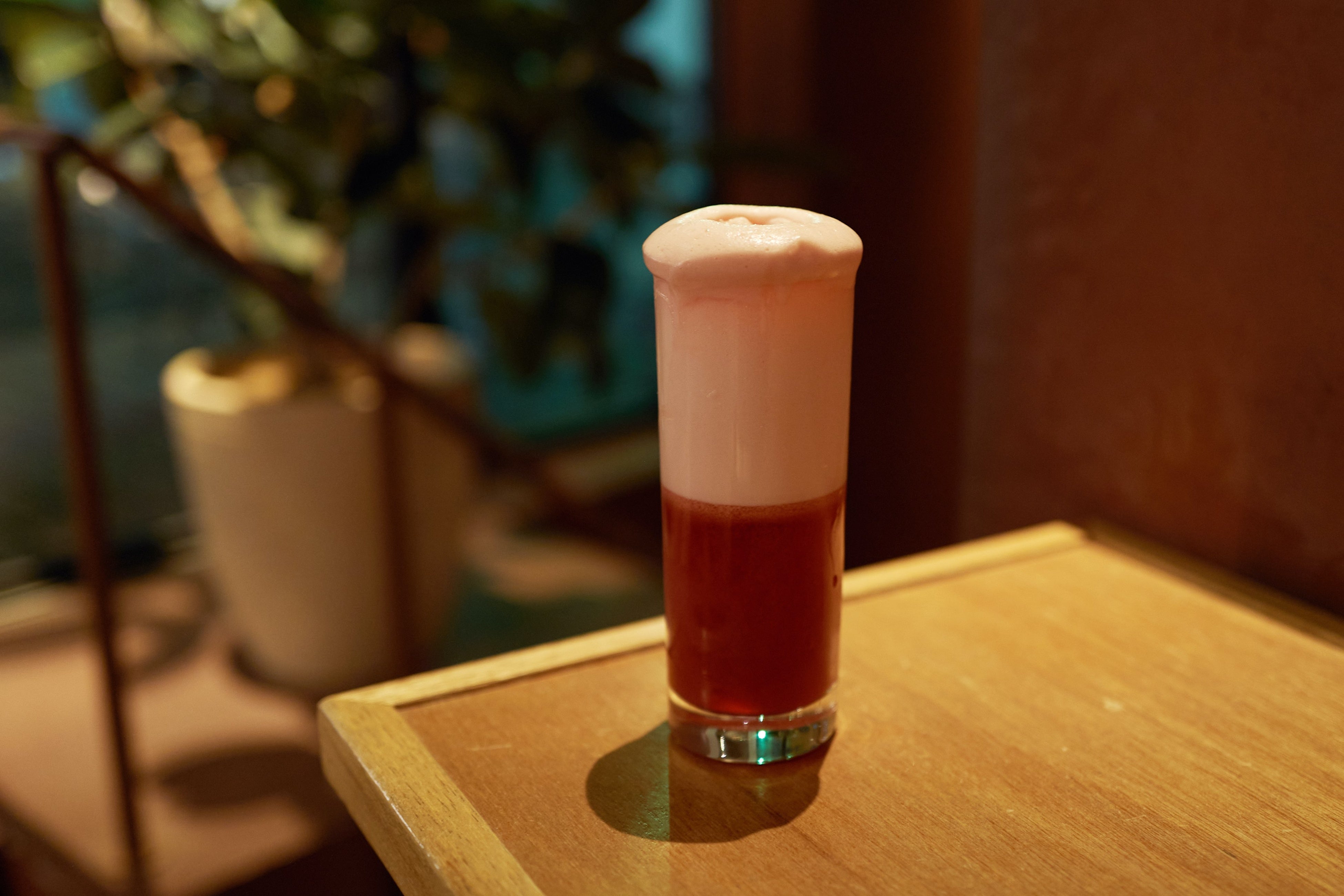 ローズベルモットを使用し、ラズベリーシロップとシェーカーでミックスしました。トニックウォーターを注ぐと、泡がモコモコ出てきてこぼれそうに。弾力のある泡は、まるでベリーの雲を食べているような感覚。紅茶を使用したノンアルコールタイプもご用意しました。