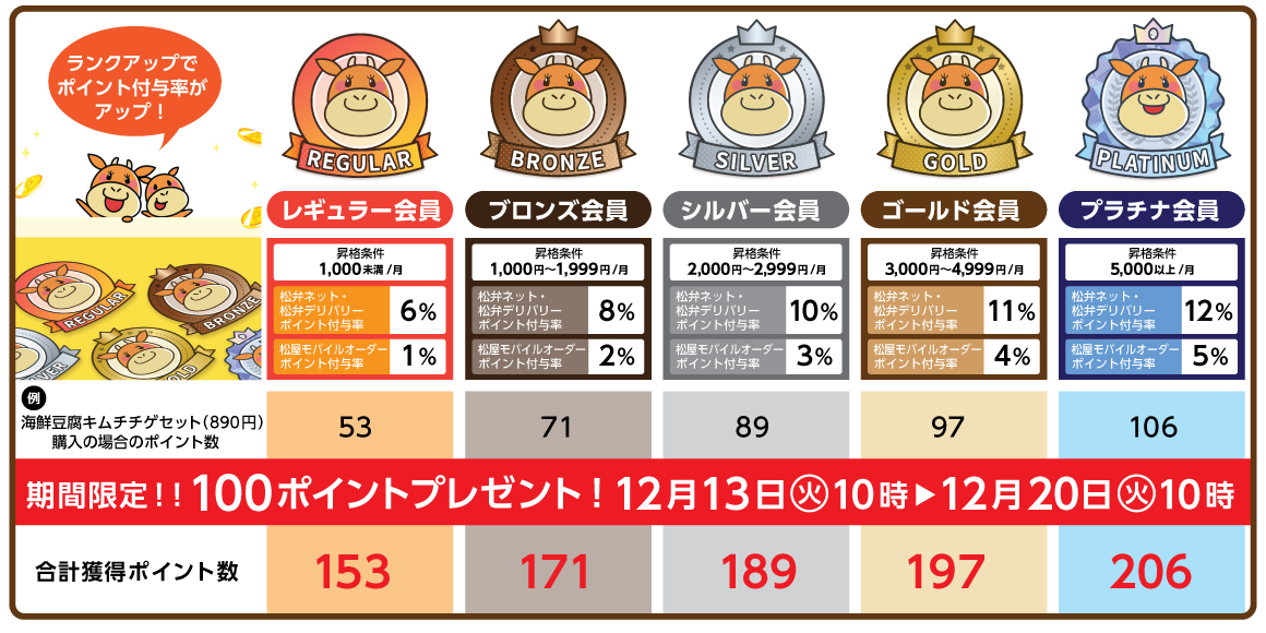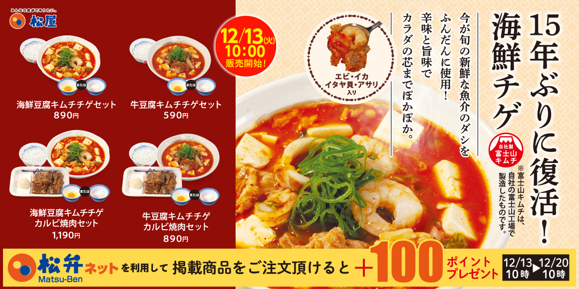 12月13日10時~12月20日10時まで、松弁ネットを利用して「海鮮豆腐キムチチゲ」「牛豆腐キムチチゲ」関連商品をご注文頂けると、100ポイントプレゼントいたします。
