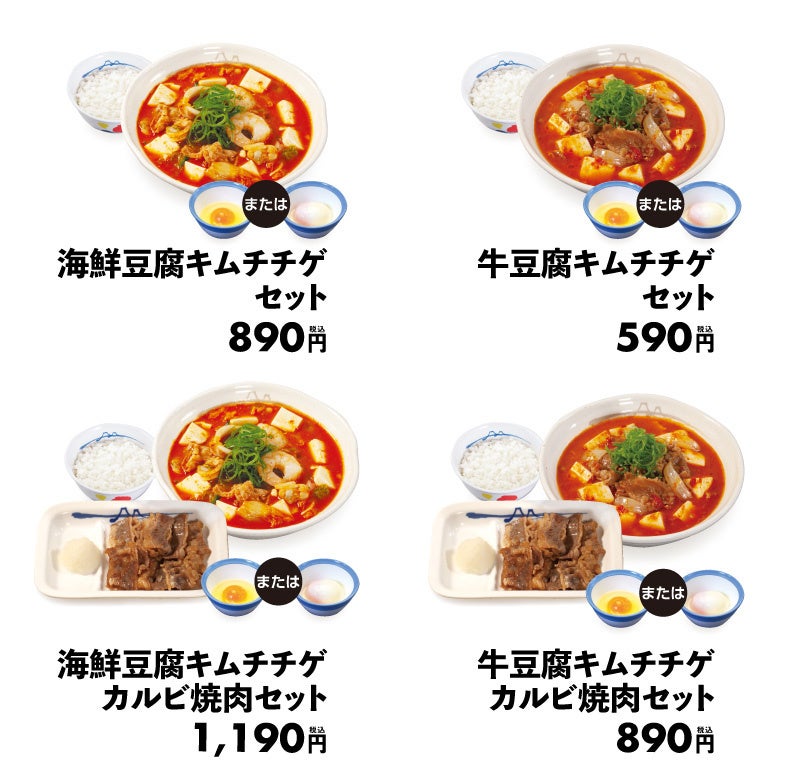 | 商品名 海鮮豆腐キムチチゲセット 890円 牛豆腐キムチチゲセット 590円 海鮮豆腐キムチチゲカルビ焼肉セット 1,190円 牛豆腐キムチチゲカルビ焼肉セット 890円 ※単品でのご購入、テイクアウトが可能です。 ※すべて半熟玉子か生玉子が選べます。 ※各豆腐キムチチゲセットを店内でお買い求めのお客様でみそ汁をご希望の方は、 従業員にお申し付けください。 ※全て税込み価格です。 ※「海鮮豆腐キムチチゲ」にも牛肉は入っております。 発売日 2022年12月13日(火)午前10時 ~ |
