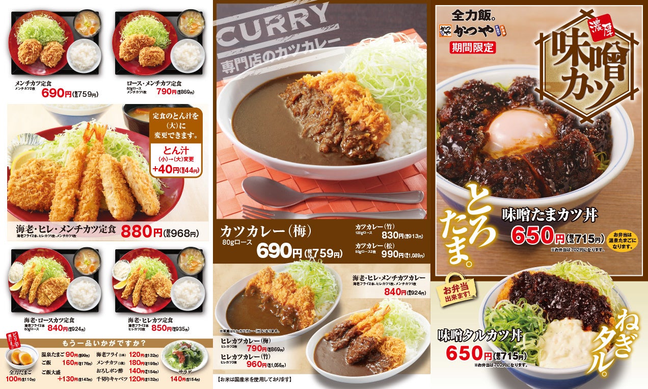 アークランドサービスホールディングス株式会社の⼦会社、とんかつ専⾨店「かつや」を展開している株式会社かつや(本社:東京都千代⽥区/代表:⼤内 勇⼀)は、国内「かつや」にて、期間限定メニュー「味噌たまカツ丼」、「味噌タルカツ丼」を2022年12月14日(水)より期間限定で販売いたします。