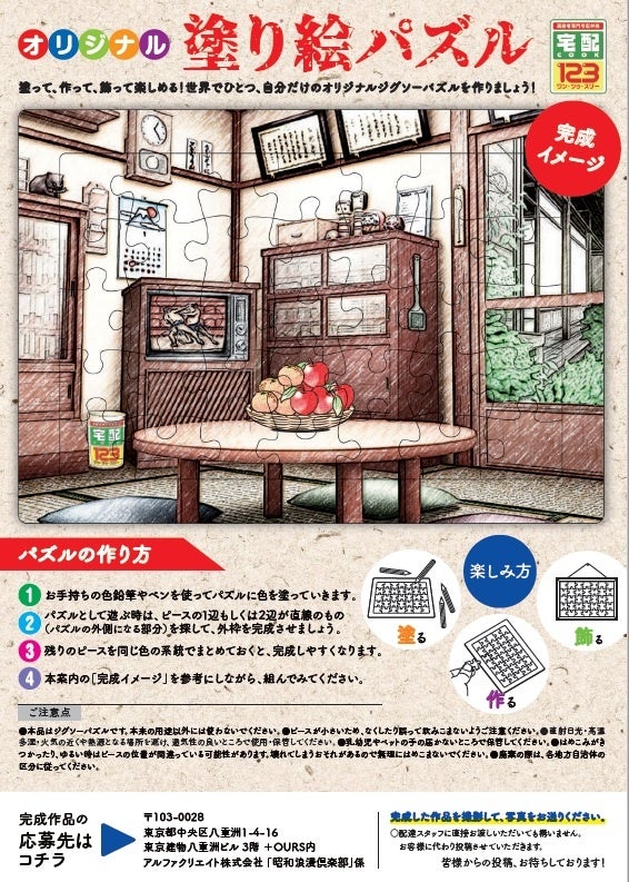 記念品は、今回新たに「塗り絵パズル」をご用意しました。指先を動かすことで脳を活性化させると言われている塗り絵は、利用者に毎月お届けしている会報誌「あはは」でも多くの方から完成した作品の写真をご投稿いただく人気の企画であり、利用者の中には、この企画をきっかけに新たな趣味となった方や、作品をコレクションしている方、会報誌「あはは」に完成した作品の写真を投稿し掲載を心待ちにする方など、利用者の楽しみや生きがいの一助になっています。塗り絵の完成後もお楽しみいただけるようパズルにしており、完成した時の達成感、作品をコレクションする満足感など、利用者の“心の栄養”に繋げていただくことを目的としています。今回の塗り絵は昭和の食卓をイメージした懐かしさを感じる絵柄となっており、利用者が昔の生活を思い出して昔話をするきっかけになればという想いを込めています。