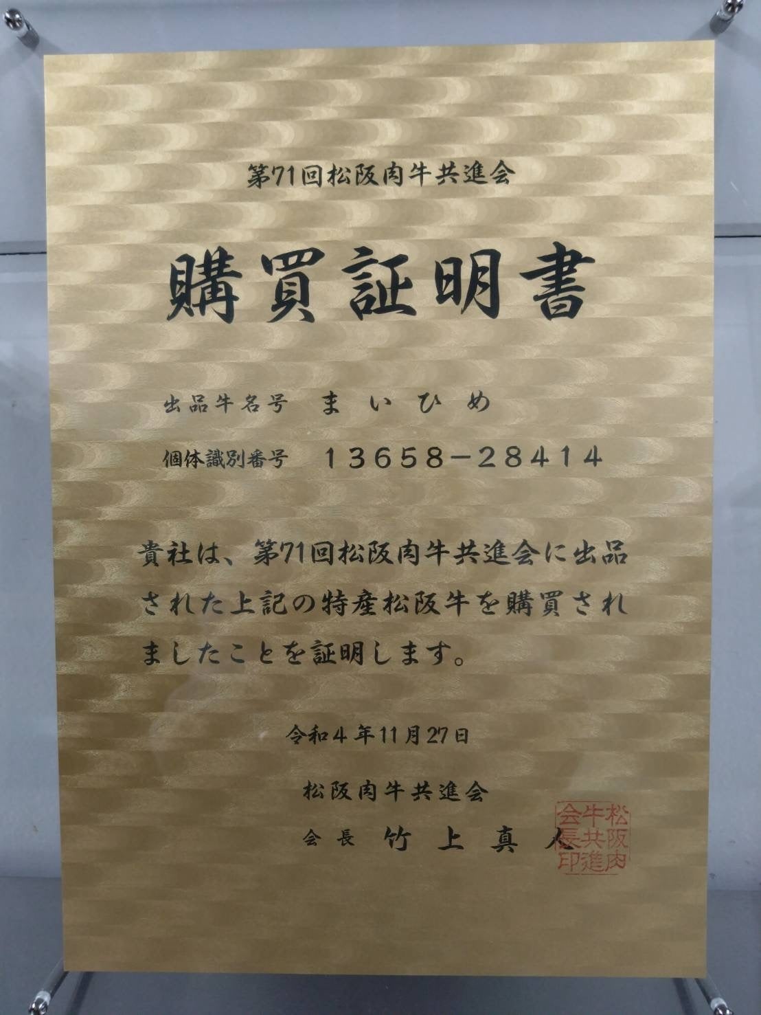 ▲優秀賞4席(4位)「特産松阪牛(津市一志町 前川誠)」 ▲購買証明書