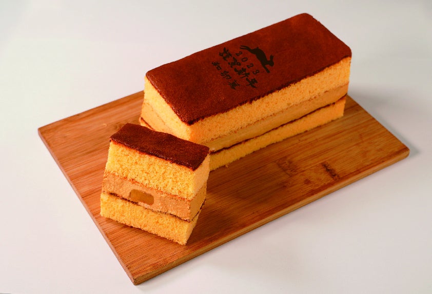 和三盆クリーム、羽二重餅を自社ブランド卵「磨宝卵ゴールド」を使用して焼き上げたしっとりきめ細やかなカステラでサンドしました。表面に新年を祝う焼き印をあしらいました。