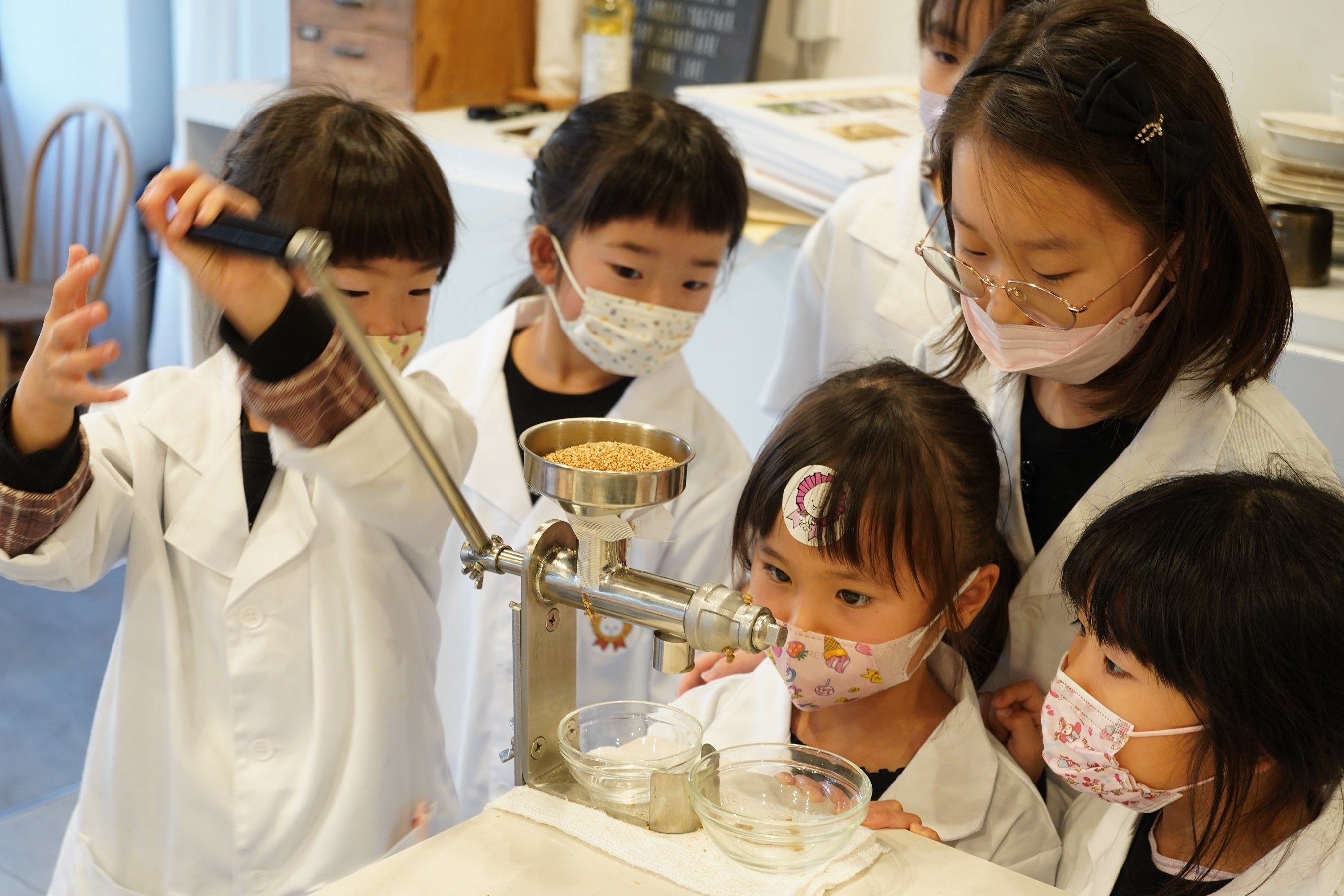 クイズ形式で楽しく知識を深め、タレづくりでは「注射器」や「ビーカー」を駆使して自分だけのレシピを研究開発します。小型搾油機で実際にごま油を搾り「ものづくり」の大変さを学んだ後は、大人も顔負けな調理にチャレンジします。