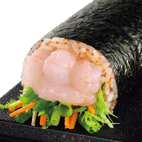 ねっとりとした食感と甘みが特長の、福井で水揚げした甘えびを、シャキシャキとしたねぎや水菜などと一緒に巻いています。