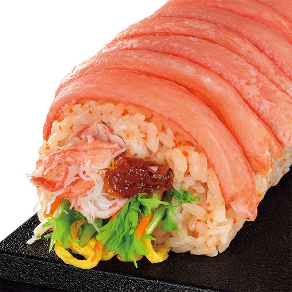 和風巻や海鮮巻、サラダ巻を一度に楽しんでいただきたいという思いから企画・開発をした、幅約12cm、重量約1.5kgの当社過去最大となる“ごくぶと”の太巻です。ほたてや煮穴子、醤油漬けいくらなど、23品目の具材を巻き上げています。カットして家族でシェアして楽しむのにおすすめのひと品です。(1/4カットは店頭でも販売します)