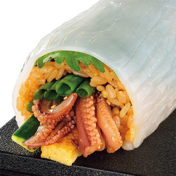 コリコリとした食感が特長の佐賀県「呼子のイカ」を使用し、ボイルした下足と食べやすく刻んだ耳部分を、飾り包丁を入れたイカの身と舎利で包んでいます。舎利(しゃり)には甘辛く煮詰めたタレを混ぜ、かんぴょうと薬味ネギと組み合わせることでイカの甘みを引き立てています。