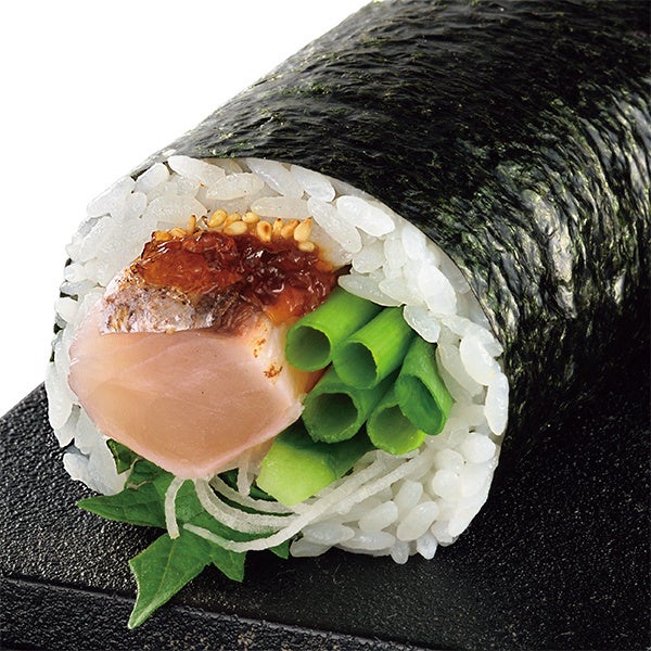 上品で淡白な味わいで、程よく脂がのる秋に大阪湾で水揚げしたサワラ使用した太巻です。ネギとキュウリ、ポン酢ジュレを一緒に巻き上げ、さっぱりと食べられます。