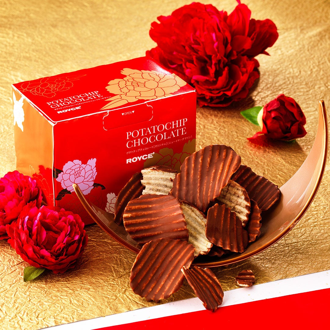 人気商品「ポテトチップチョコレート[オリジナル]」がお正月にぴったりのデザインになって登場!パリッとした軽快な食感のポテトチップの片面に、まろやかな味わいのチョコレートをコーティングしたクセになるおいしさです。パッケージは芍薬の花をあしらった華やかなデザインです。