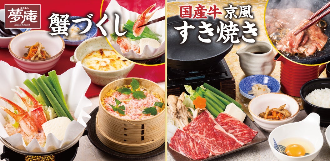 | 【夢庵で楽しむ年末年始 おすすめポイント】 ① 年末年始はお手頃価格でご馳走を!厳選食材を熱々の“冬鍋膳”で! 2種類の蟹をふんだんに使った蟹づくし御膳や、国産牛肩ロース肉を夢庵“初”の京風に仕立てたすき焼き御膳など、4 種の“あったか鍋御膳”が登場。 税込1,649円~お楽しみいただけます。 ② こだわりの“特製生(なま)そば”がご自宅でも!年越し用のお持ち帰り仕様に 今年6月のリニューアルで、のど越し良く、風味豊かになった生(なま)そばを年越し蕎麦としてお楽しみいただけます。 |