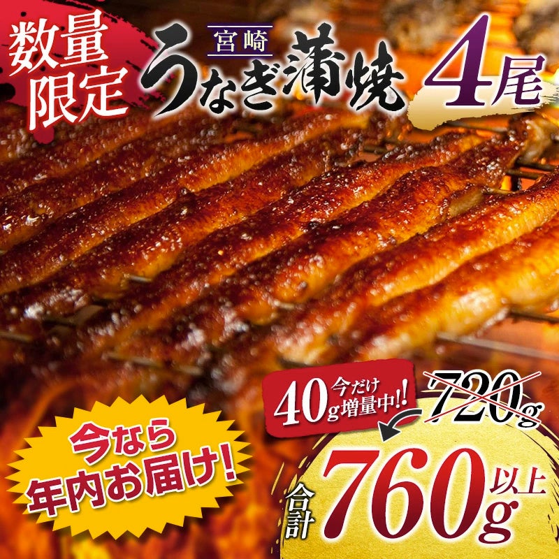 ◎【ふるさと納税】今だけ40g増量!!国産うなぎ蒲焼(4尾) 合計760g以上 新富町産鰻 【数量限定】 ウナギ 支援 鰻楽