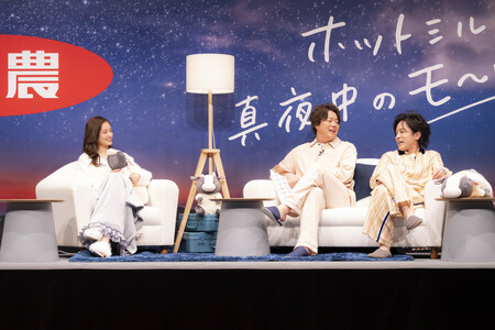 ゲストの谷まりあさん・ぺこぱさんがパジャマ姿で登場! 超熟睡BGMと一緒にホットミルクを体験し、寝落ちしかける場面も… 「JA全農 ホットミルクと真夜中のモ〜ツァルト」PR発表会 開催