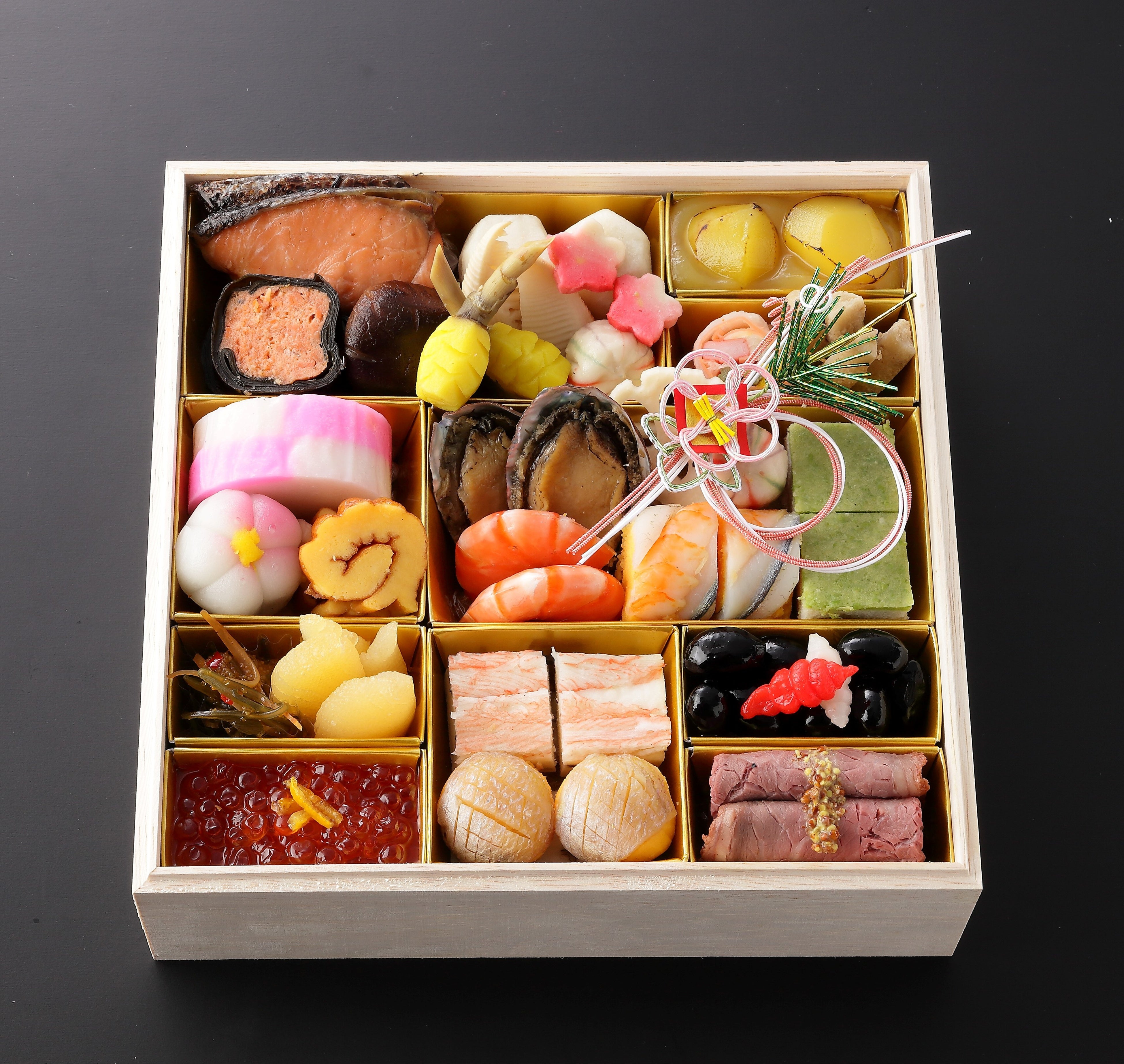 林檎金団栗入り 牛蒡胡麻煮 五色砧巻き 蓮根白煮 手鞠麩 手綱黄味寿司 若松寄せ 黒豆・紅白長老貴 ローストビーフ 穂付き筍 姫慈姑 紅鮭昆布巻き 富喜青煮 里芋旨煮 梅麩 冬茹椎茸 鮑柔らか煮 海老艶煮 小鯛茶巾 蟹袱紗寄せ 銀鮭酒粕焼 紅白蒲鉾 伊達巻き 花餅 数の子鼈甲漬け 松前漬け いくら(繊柚子)
