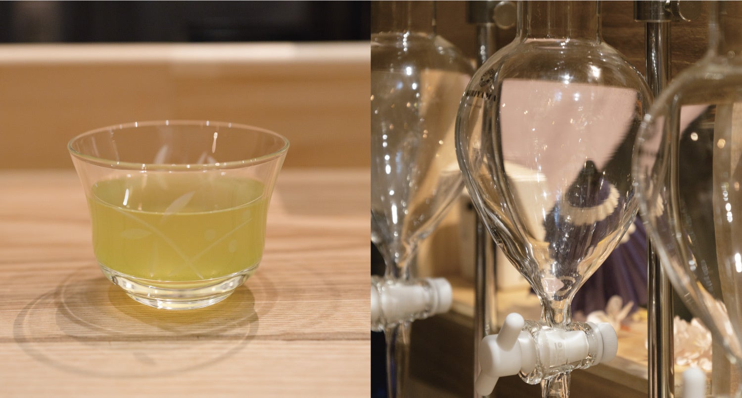 「水出し」の緑茶とガラス製の水出し緑茶抽出器