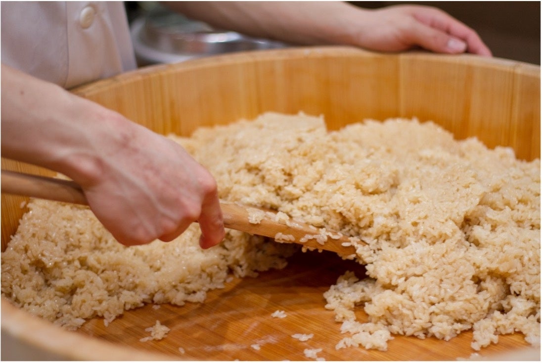 色合い・熟成度の異なる数種類の赤酢を自店にて調合しております。もちろんお米も釜炊き。毎日朝夕2回、お客様の来店にあわせて、シャリ切りをする、こだわりの赤酢シャリです。
