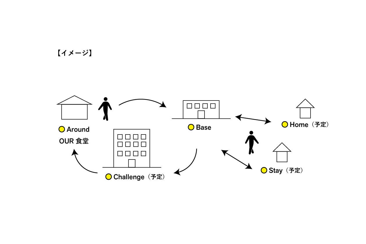 各拠点にはA~Z を頭文字として役割を与え(物件の外壁にアルファベットを印字、マップの制作等)、まちに必要な役割を提示することで、一つ一つのコンテンツのまちに対する存在意義を明確化します。OUR 食堂は、公園からその周辺に回遊するきっかけとなる拠点という意味を込めて「A=Around(周辺)」に当たります。A~Z すべての拠点が揃ったとき、本事業においては、まちに必要な役割が充足したと定義し事業の完結とします。