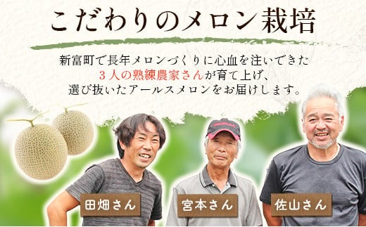 6月は、新富町で長年メロンづくりに心血を注いできた3人の熟練農家さんが育て上げ、選び抜いた大玉のアールスメロンをお届けします!