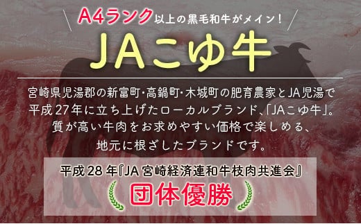 宮崎県 児湯(こゆ)郡 の「JA児湯」管轄の3町(宮崎県児湯郡新富町・高鍋町・木城町)で肥育された、宮崎黒毛和牛ローカルブランドです。独自の生産・販売ルートで比較的購入しやすい価格帯となっていますが、肉質はA4ランク以上が大半を占め、認知度の高い宮崎牛と同等の高品質です。