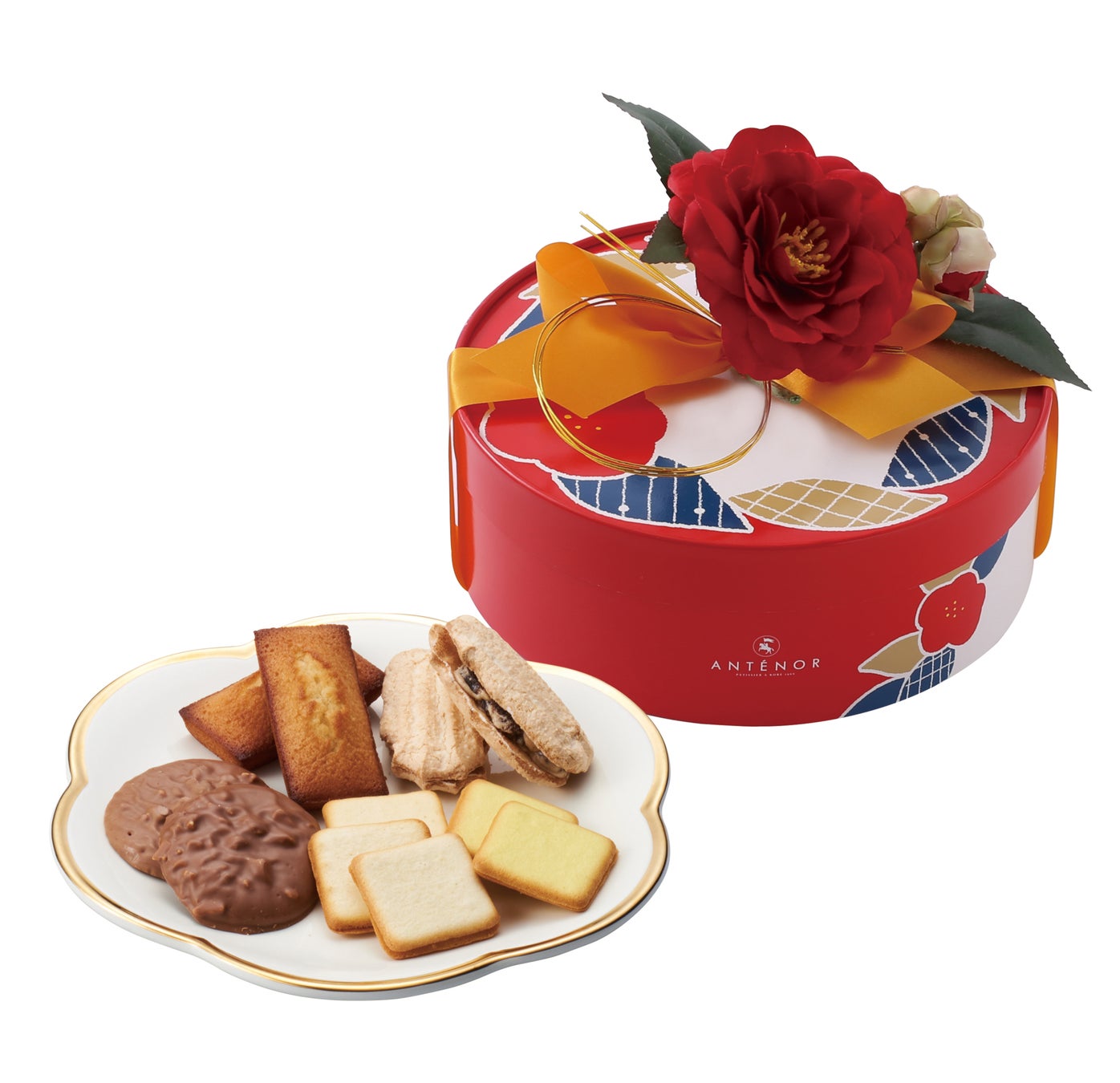 「フィナンシェ」「レーズンサンド」に、チョコレートに包まれた人気のアーモンドクッキー「ショコラ・アマンド」、ベルギー産チョコレートサンドのラング・ド・シャを詰め合わせて。椿の華やかさが目を惹く迎春限定商品です。