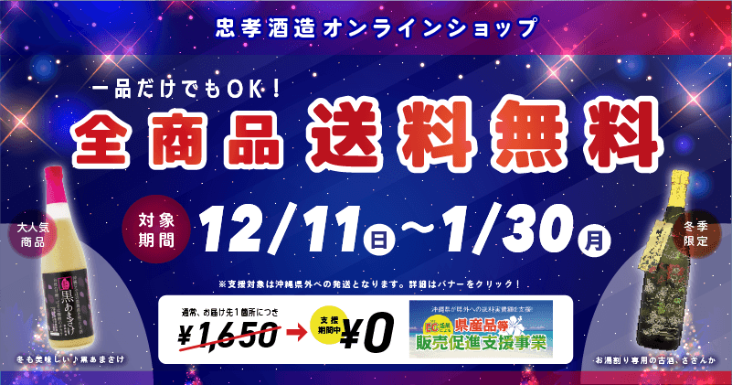 『至高の熟成を極める』忠孝酒造株式会社(本社:沖縄県豊見城市、代表取締役社長:大城 勤)は「忠孝酒造オンラインショップ」にて全商品送料無料キャンペーンを開始。期間は12/11(日)~1/30(月)。冬季限定古酒や甘酒とともに、体も心もほっこりと沖縄気分をお楽しみください。
